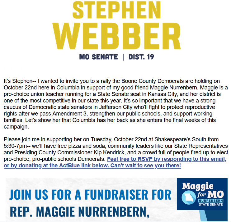 For all of Stephen Webber’s Achilles-sulking-at-the-boats bit because Senate Dems sold out Boone County last session, he’s pitching in to raise money for Rep. Maggie Nurrenbern in Senate 17….