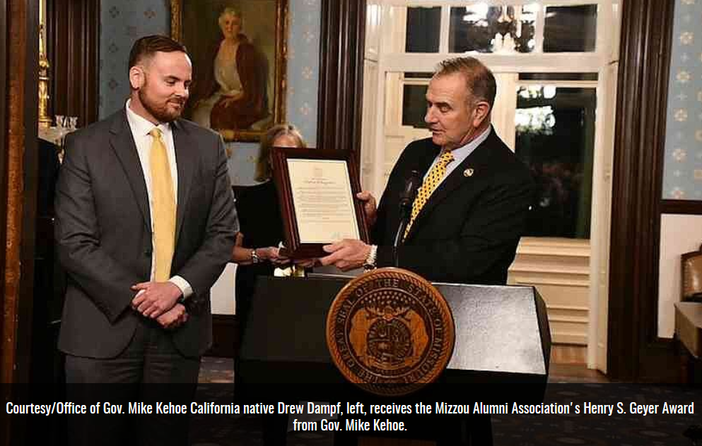 News Tribune reports that “Drew Dampf received the Henry S. Geyer Award from the Mizzou Alumni Association. Gov. Mike Kehoe bestowed the honor on him Tuesday at the Governor's Mansion… the award ‘recognizes public officials and citizens who positively impact higher education.’”