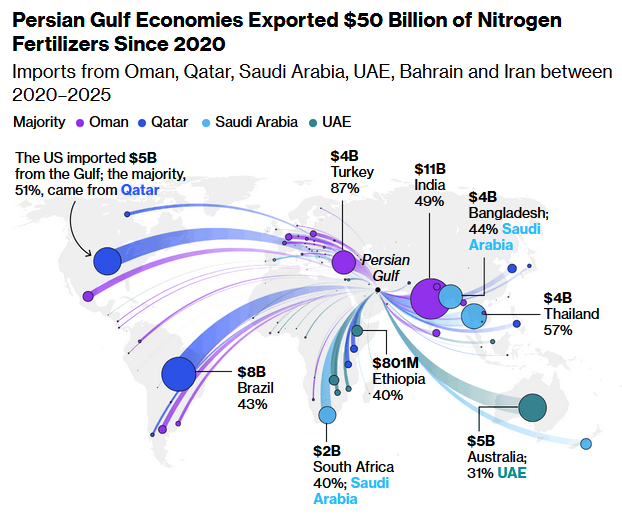 3. Oil isn’t the only export from the Middle East. “The conflict has come at a sensitive moment for global agriculture. The cost of fertilizers is already high.”